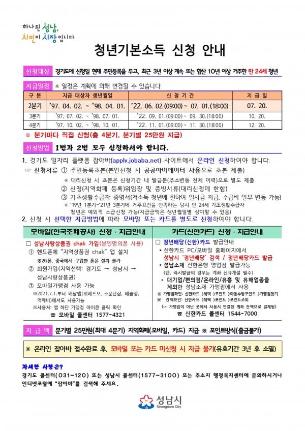 성남시는 오는 7월 1일까지 올해 2분기 청년기본소득 지급 신청을 받는다.청년기본소득은 만 24세 청년에게 분기별로 25만원씩, 연 100만원을 모바일이나 카드 형태의 성남사랑상품권(지역화폐)으로 지급하는 청년지원정책이다.