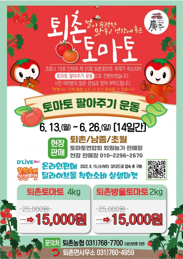 퇴촌면 관계자는 “축제는 취소됐지만 소비자들께 퇴촌 토마토의 우수성을 알리고 저렴한 가격으로 질 좋은 토마토를 제공하고자 토마토 팔아주기 운동을 진행하게 됐다”며 “이번 토마토 팔아주기 운동은 2주 동안 진행하는 만큼 보다 많은 시민들께서 좋은 품질의 퇴촌 토마토를 즐길 수 있었으면 좋겠다”고 말했다.