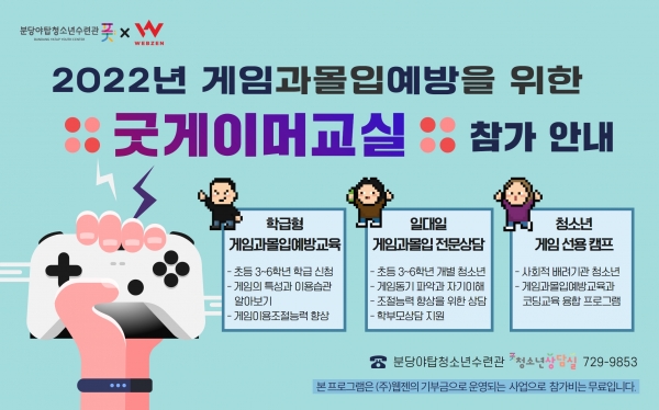 성남시청소년재단(대표이사 진미석) 분당야탑청소년수련관은 청소년의 게임과몰입을 예방적으로 지원하기 위한‘굿게이머교실’을 본격 운영한다고 13일 밝혔다.굿게이머교실은 게임 전문기업 웹젠(대표이사 김태영)과 함께 올해 처음 시작하는 청소년 게임과몰입 예방사업이다.