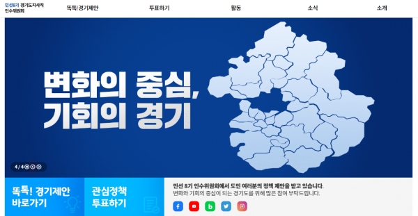 한편, 여론조사 참여를 원하는 도민은 민선 8기 경기도지사직 인수위원회 공식 홈페이지(https://www.gg.go.kr/8th-gginsu/main.do)에 접속해 홈페이지 중단의 ‘관심정책 투표하기’ 또는 상단에 있는 ‘투표하기’, ‘관심정책’을 누르면 된다.