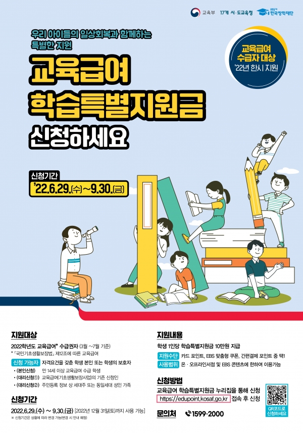 지원대상은 올해 3월부터 7월까지 교육급여 수급 자격을 가진 초·중·고 학생이며, 이 지원금을 지원받기 위해서는 7월까지 수급 자격이 결정돼야 한다.지원을 희망하면 29일부터 9월 30일까지 교육급여 학습특별지원금 신청 누리집(edupoint.kosaf.go.kr)을 통해 온라인으로 신청해야 한다.