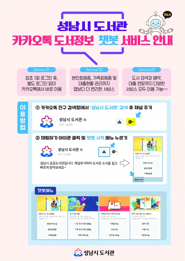 스마트폰의 카카오톡 앱 친구 검색창에서 ‘성남시 도서관’을 찾아 채널 추가, 채팅하기 아이콘을 차례로 누르면 해당 서비스를 이용할 수 있다. 성남시 공공도서관 회원 가입 상태여야 한다.한번 로그인해 놓으면 그 상태를 지속 유지해 챗봇 이용이 편리하다.