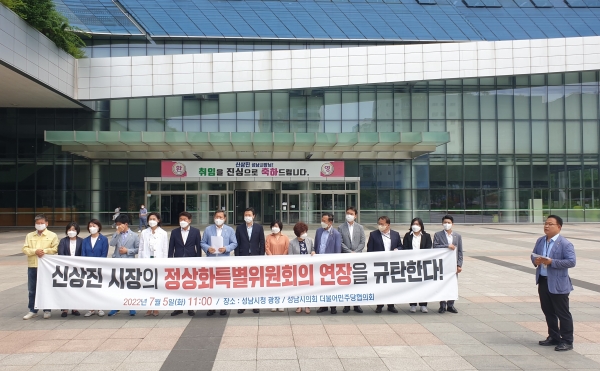 민선8기 신상진 시장이 성남시민의 삶의 질 향상을 위한 화해와 협치의 시정운영보다 전임시장들에 대한 망신주기와 부패도시책임자로 낙인찍는 정치보복과 정쟁으로 시정을 이끌겠다는 것으로 받아 들여 성남시의회 더불어민주당협의회의원 일동은 다음과 같이 이를 강력히 규탄한다.