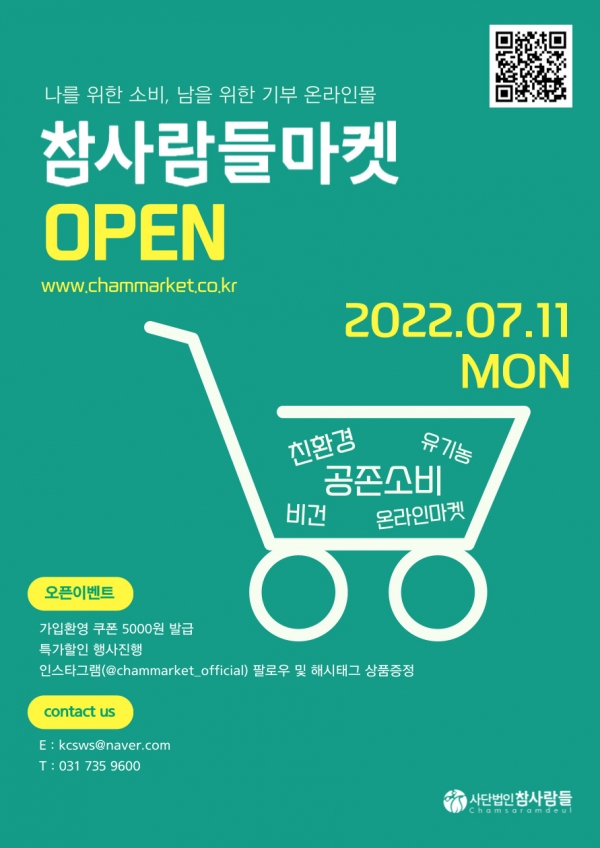 신규 회원가입자 선착순 100명에게 5,000원 할인쿠폰을 발행하며 인스타그램 ‘좋아요’와 ‘공유’를 통한 상품증정,특가상품전 등 다양한 이벤트도 동시에 진행된다.참사람들 회원대표는 “참사람들의 발전에는 언제나 사회를 이롭게 하고자 하는 소중한 분들의 마음이 함께했지만, 최근 코로나19로 인한 위기가 지속되면서 기업과 함께 복지분야 역시 새로운 경영 환경에 직면했다”며