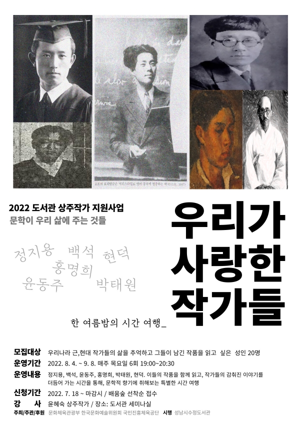 윤혜숙(도서관 상주작가) 작가가 진행하는 이번 문학 프로그램은 정지용, 백석, 윤동주, 홍명희, 박태원, 현덕의 작품을 읽고 작가들의 삶을 들여다보는 내용으로 구성돼 있으며 8월 4일부터 9월 8일까지 매주 목요일에 1시간 30분씩, 총 6회로 운영된다.