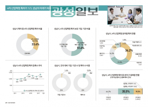 보고서에 따르면 2018년 8월 현재 성남시 1,098개 사업체들이 4차 산업혁명 7개 분야에서 1만2,691건의 특허를 보유하고 있다. 특히 연구개발 성향이 있는 관내 기업과 기관 가운데 절반 이상인 51.6%가 이들 특허를 보유하고 있어, 성남시가 4차 산업혁명 기술개발에 집중한 노력이 결실을 이루고 있는 것으로 분석됐다.