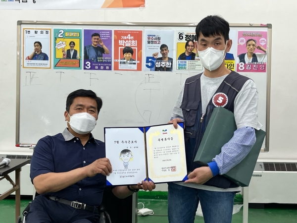 근로자들이 직접 우수 근로자를 투표로 선택하는 시간을 마련, 7월 우수 근로자로 기호 5번 성주한 근로