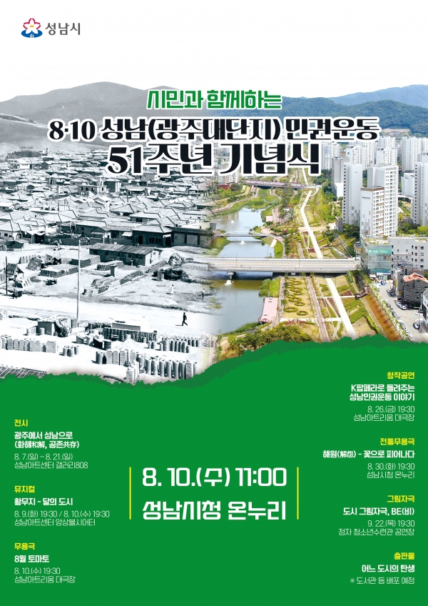 성남시는 8·10 성남(광주대단지)민권운동 51주년을 맞아 오는 8월 10일 오전 11시 시청 온누리에서 기념식을 연다.기념식은 1971년 당시 성남민권운동을 다룬 뮤지컬 ‘황무지’ 공연(20분), 하동근 기념사업추진위원장의 기념사, 신상진 성남시장의 축사, 축하공연 등의 순으로 진행된다.시민 누구나 무료로 관람할 수 있는 공연과 전시행사도 지역 곳곳에서 열린다.