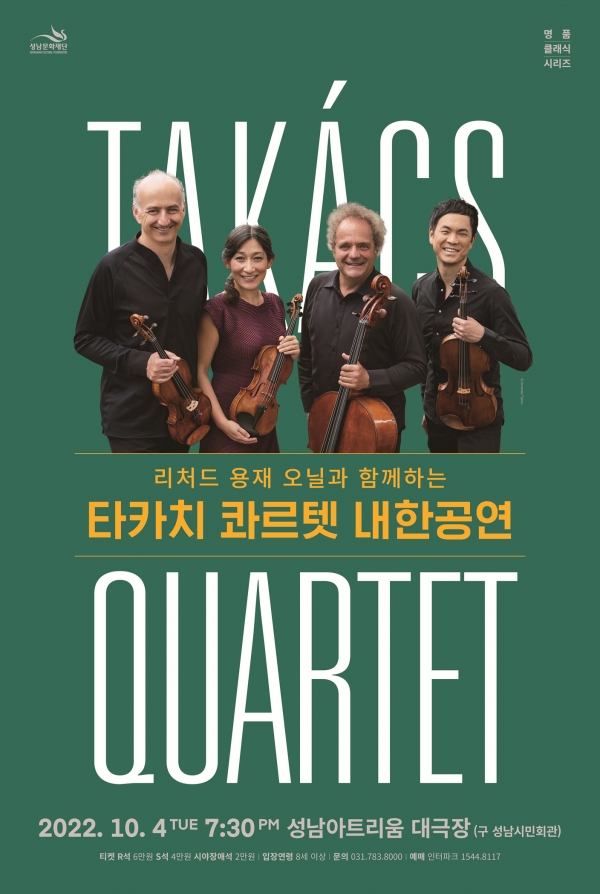 이에 1975년 헝가리 국립 프란츠 리스트 음악원 동기생들이 모여 창단한 타카치 콰르텟은 올해로 47번째 시즌을 맞이한 세계적인 실내악 앙상블이다. 1977년 프랑스 에비앙 국제 현악사중주 콩쿠르 우승을 시작으로 세계적인 현악사중주 콩쿠르에서 연이어 입상하며 차세대 실내악단으로 이름을 알렸고, 2012년 시작된 영국 그라모폰 명예의 전당 리스트에 번스타인, 하이페츠, 자넷 베이커와 함께 현악사중주단으로는 유일하게 헌액되기도 했다.