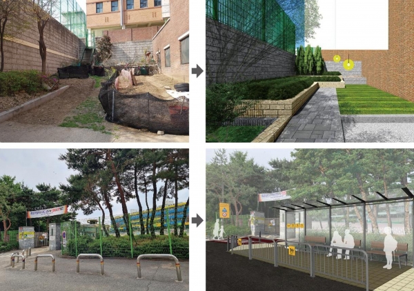 성남동초등학교 정문 앞에는 ‘기다림 쉼터’를 새로 조성한다. 학생들은 등하교 차량에서 안전하게 승하차하고, 학부모들은 자녀들의 하교를 기다리는 공간으로 활용된다.