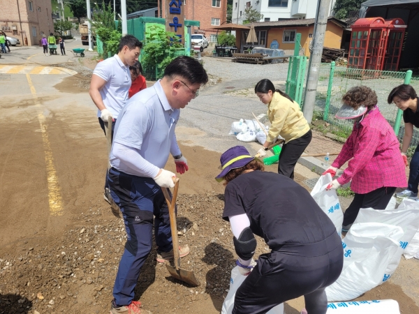8/12(금) 오전10시 분당구 금곡동(동장 마광자)내 토사유출로 통행이 막힌 곳을 방문하여 금곡동 주민센터 직원들과 통장, 그리고 성남시의회 국민의힘 소속 시의원들이 함께 땀을 흘려 복구를 마무리 하였다.이 자리에 성남시의회 더불어민주당 조정식 대표의원도 함께 수해복구 현장에 일손을 도왔다.