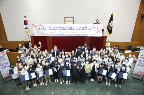 성남시청소년재단(대표이사 진미석) 중원청소년수련관에서는 2022년 8월 13일(토) 10:00부터 약 한 시간에 걸쳐 성남시의회 본회의장에서 실내 방역 수칙을 준수하며 제7대「성남시청소년의회」당선증 교부식을 진행했다.