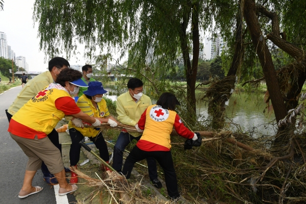 분당구에 위치한 불정교, 신기교 인근에서 실시된 이번 복구작업은 주민자치위원회, 통장, 새마을회, 바르게살기운동협의회, 자율방재단, 대한적십자사봉사회 6개 유관단체 150여명과 공무원 50여명이 참여하여 합동으로 실시되었다.