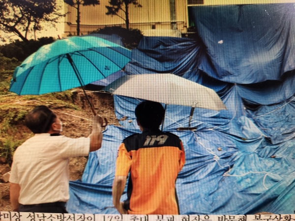 박미상 성남소방서장이 17일 축대 붕괴 현장을 방문해 복구상황을 점검하고 있다