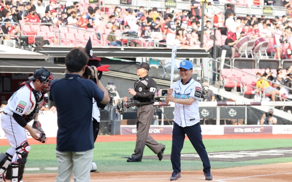 염 의장은 이날 열린 수원 KT위즈와 광주 KIA타이거즈의 경기에 앞서 그라운드에서 관중들에게 KT위즈의 승리를 향한 메시지를 전한 뒤 김 지사의 시구를 시타했다.