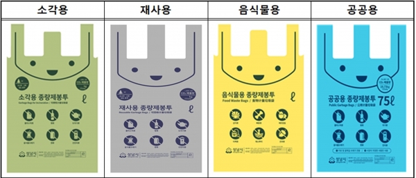 소각용과 재사용 봉투의 경우, 담으면 안 되는 품목인 플라스틱류·병류·도자기류·음식물쓰레기·캔류·전지류 모양에 사선을 그어 알기 쉽게 표기했다.온실가스 저감을 위해 규격별 탄소 배출량도 표기했다.