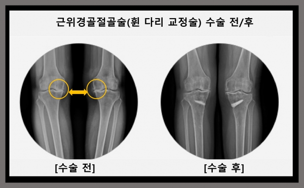 권오룡 연세스타병원 병원장(연세대학교 세브란스병원 정형외과 외래교수) 은 “휜 다리 교정술은 O자형 다리를 곧게 펴줌으로써 무릎 안쪽으로 실렸던 하중을 바깥쪽으로 분산시키고 무릎뼈를 교정하여 통증을 감소시키는 치료법이다. 중기관절염 치료에 효과적이고 관절염의 악화를 막거나 진행 속도를 늦출 수 있어 관절 수명도 연장된다”고 전했다.