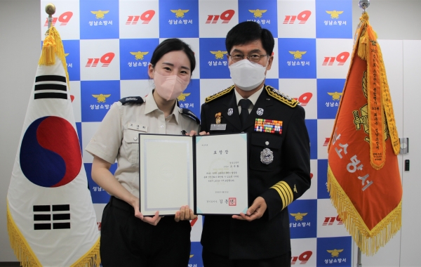 성남소방서장으로 부터 경기도지사 표창을 전수 받고 있다.