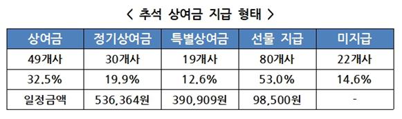 상여금 지급 수준은 일정금액으로 지급하는 경우, 정기상여금은 평균 536,364원, 특별상여금은 평균 390,909원, 상품권 등 선물을 지급하는 경우 평균 98,500원 상당의 물품을 지급하는 것으로 조사되었다.