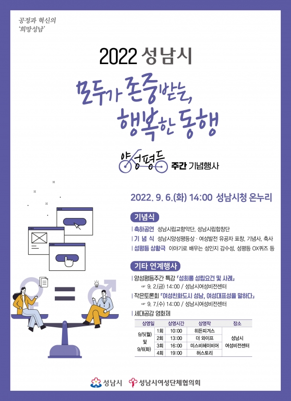 성남시는 양성평등주간(9.1~7)을 맞아 9월 2일부터 오는 7일까지 ‘모두가 존중받는 행복한 동행’을 주제로 다양한 시민 행사를 연다.양성평등주간 기념식은 오는 9월 6일 오후 2시 시청 온누리에서 300여 명이 참석한 가운데 열린다.