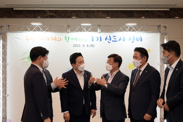 신상진 성남시장은 8일 오후 서울시 정부서울청사에서 원희룡 국토교통부 장관 주재로 열린 1기 신도시를 품은 5개 지자체장*과의 간담회에서 1기 신도시 도시정비사업에 속도를 내겠다고 밝혔다. *성남시장(분당), 고양시장(일산), 안양시장(평촌), 부천시장(중동), 군포시장(산본)
