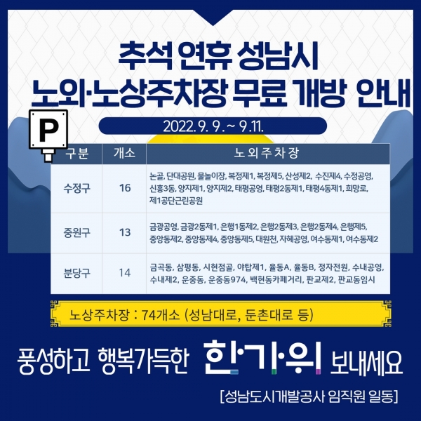 성남도시개발공사(사장 정건기, 이하 공사)는 추석 명절을 맞아 주차난 해소와 시민의 주차 편의제공을 위해 오는 9월 9일부터 11일까지 3일간 노외주차장 43개소, 노상주차장 74개소를 무료 개방한다.