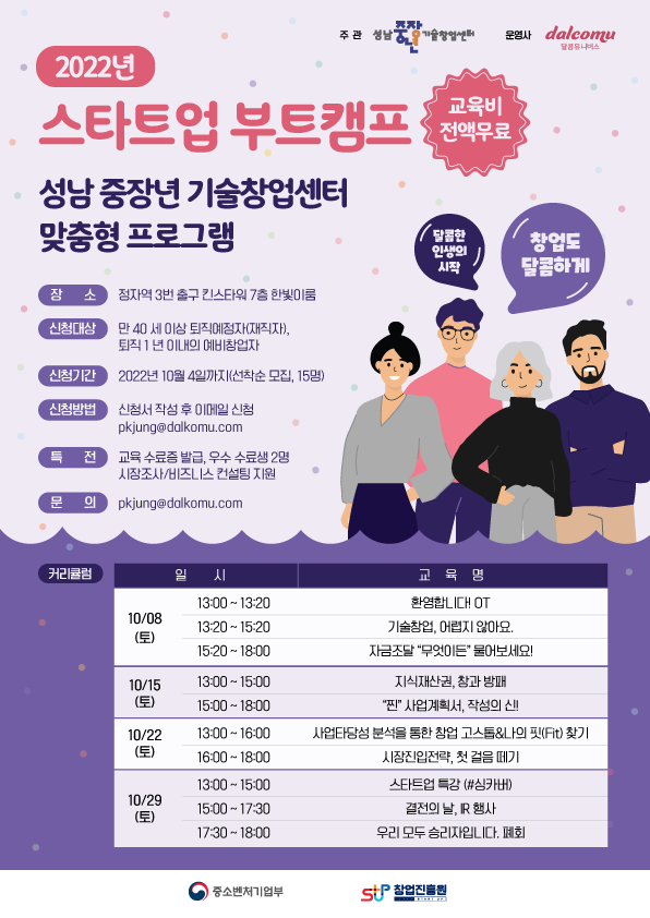 스타트업 부트캠프는 성남 중장년 기술창업센터에서 ‘2022년 중장년 기술창업센터 세부관리기준 개정안 제 28조’에 의거하여 만 40세 이상 퇴직 예정자 및 퇴직 1년 이내의 예비창업자의 창업 성공률을 제고하기 위해 마련했다.전액 무료로 진행되는 이번 캠프 참가자 모집기간은 내달 4일까지이며 선착순으로 총 15명을 모집할 예정이다.