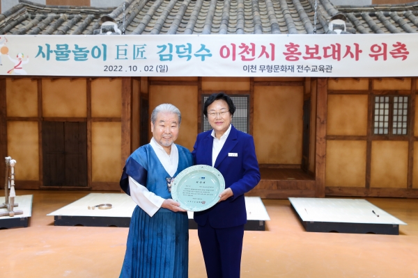 이천시(시장 김경희)는 10월 2일(일) 대한민국 사물놀이 거장 김덕수 명인을 이천시 홍보대사로 위촉했다.김덕수 명인은 대한민국 국민이라면 모르는 사람이 없을 정도로, 수많은 열정적인 공연 을 통해 사물놀이, 나아가 국악의 저변 확대에 큰 기여를 해왔으며, 외국에서도 높은 평가를 받으며 사물놀이의 진수를 전 세계에 전파하여 국위를 선양하여 왔다.