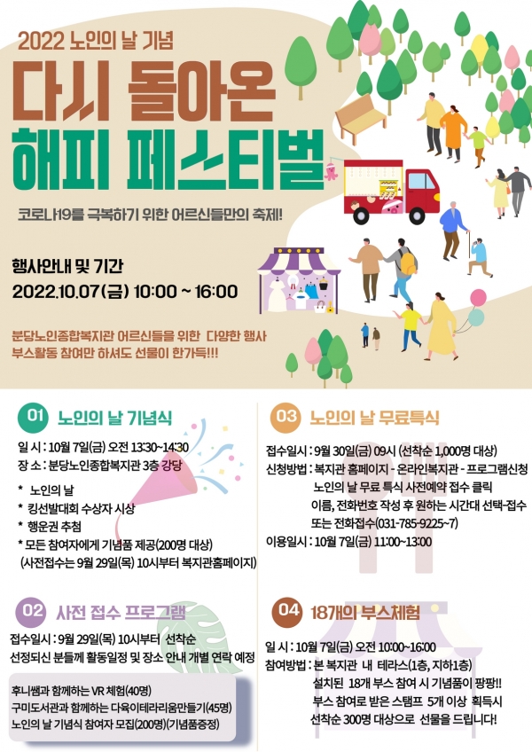 분당노인종합복지관은 오는 10월 7일(금) 오전10시부터 오후4시까지 분당노인종합복지관에서 '2022년 해피 페스티벌_다시 돌아온 해피페스티벌'이라는 이름으로 장기화 된 코로나 시기에 힘든 날을 보낸 어르신들에게 ‘노인의 날’을 맞아 노인공경의 의미를 더 깊이 이해하고 기념하고자 대면 행사로 진행될 예정이다.