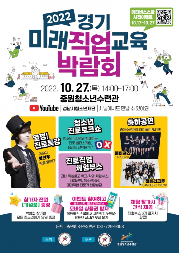 성남교육지원청(교육장 신승균)과 성남시청소년재단(대표이사 진미석)은 10월 27일 ‘2022. 경기미래직업교육박람회’를 개최한다.‘2022. 경기미래직업교육박람회’는 경기도교육청에서 주최하고 경기도성남교육지원청과 성남시청소년재단 중원청소년수련관이 공동 주관하는 진로 박람회다.