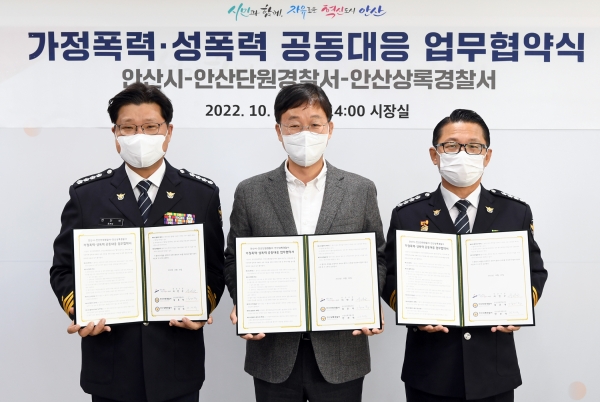 안산시(시장 이민근)가 가정폭력·성폭력 피해자를 위한 원스톱서비스를 제공한다.시는 20일 단원경찰서(서장 강은석), 상록경찰서(서장 반진석)와 가정폭력·성폭력 공동대응을 위한 업무협약을 체결했다.