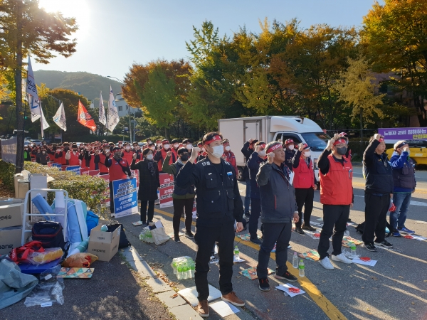 성남시 소재 지난 24일 한국지역난방공사 본사 앞에서 자회사 지역난방안전(주) 노동자들이 단체협약해지 철회, 구조조정 중단, 시민안전 확대 요구를 촉구하는 '공공운수노조 지역난방안전지부 파업돌입 결의 대회'가 진행됐다.