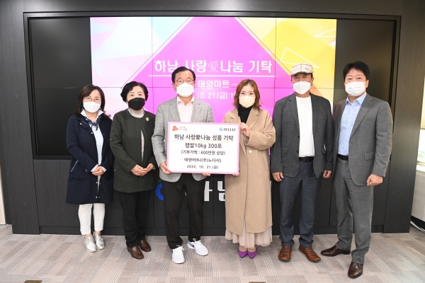 태양마트(㈜노다지)(대표 김하나)는 지난 21일 하남 사랑愛나눔 성품으로 햅쌀 10㎏ 300포(기부가액 600만원 상당)을 기탁했다고 밝혔다.이날 기탁식에는 이현재 하남시장을 비롯하여, 태양마트 김하나 대표, 덕풍재래시장 김재근 상인회장이 참석했다.