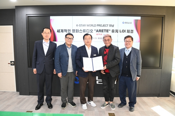 하남시(시장 이현재)가 ‘아레떼 프로젝트’(ARETE Project) 협력의향서(LOI)를 체결하며 ‘K-스타월드 조성사업’의 주요시설 중 하나인 글로벌 영화제작 프로덕션 스튜디오 건설에 한 걸음 더 다가섰다.26일 하남시에 따르면 시는 지난 25일 오후 1시 하남시청 시장 집무실에서 이현재 하남시장, 주기용 하남시 투자유치단장, 아레떼 프로젝트 대표, 아레떼 프로젝트 최고운영책임자 등 관계자들이 참석한 가운데 ‘아레떼 프로젝트 LOI’를 체결했다고 밝혔다.