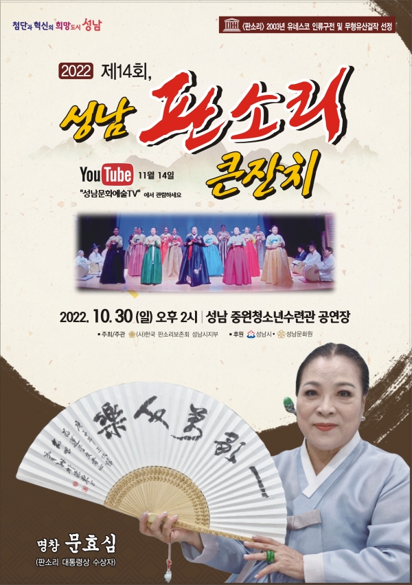 성남시는 문화의 달 10월 아름다운 계절에 (사)한국판소리보존회 성남시지부(지부장 문효심 명창)가 주최하는 ‘제14회 성남 판소리 큰잔치’가, 10. 30(일)오후2시 성남시 중원청소년수련관 공연장에서 열리며, 11월 14일 성남문화예술TV 유튜브를 통해 영상으로도 볼 수 있다.