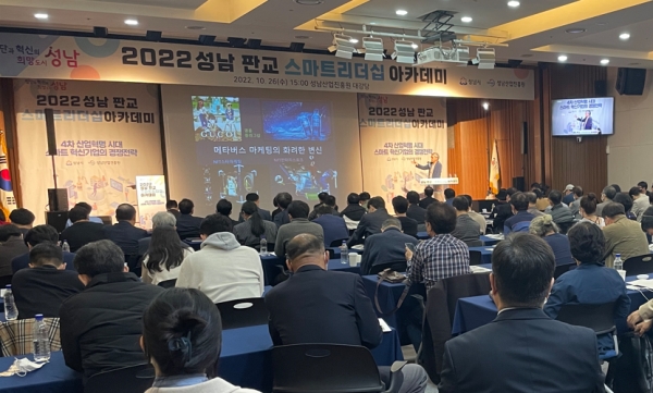 성남산업진흥원(원장 류해필)은 ‘2022 성남 판교 스마트리더십 아카데미’를 26일 진흥원 대강당에서 개최했다.‘4차 산업혁명 시대 스마트 혁신기업의 경쟁전략’을 주제로 개최된 이번 아카데미에서는 중소기업의 메타버스 활용 방안, 디지털 전환에 대응한 기업의 조직혁신 전략에 대한 전문가들의 강연과 참석자들과의 질의응답이 이어졌다.