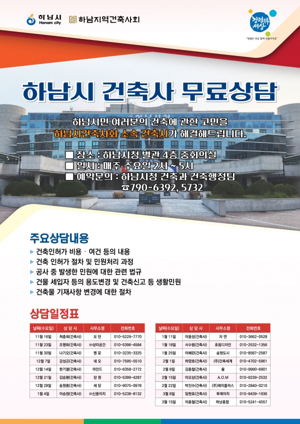 시는 특히 오는 16일부터 하남지역건축사회와 함께 건축 관련 무료상담실도 운영한다. 이는 지난 9월 하남시가 하남지역건축사회와 가진 간담회에서 건축사 무료상담실 운영 방안을 협의한 데 따른 것이다.건축사 무료상담은 16일부터 시청 별관 4층 중회의실에서 매주 수요일 오후 2시부터 5시까지 실시한다. 하남지역건축사회 소속 건축사가 한명씩 상주해 상담을 진행할 예정이다. 행사 당일 누구나 방문해 상담할 수 있고, 사전에 상담을 신청해 참여할 수도 있다.