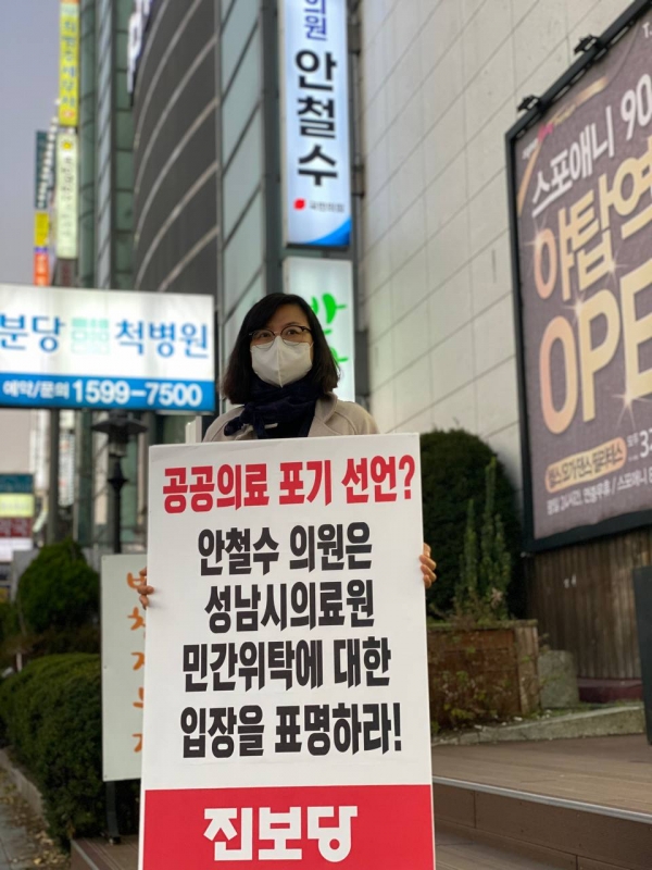 국민의힘 신상진 성남시장과 시의원들이 시민이 만든 공공병원 성남시의료원 강제민간위탁을 추진하는 가운데, 진보당 김미라 분당구위원장이 5일 야탑동 지역사무실 앞에서 안철수 국민의힘 국회의원의 명확한 입장을 요구하고 나섰다.김미라 위원장은 1인 시위를 통해 "안철수 의원은 공공의료를 포기한 것이 아니라면 성남시의료원 민간위탁을 추진하는 신상진 성남시장의 반시민적 보건의료정책에 대해 자신의 입장을 밝히라“고 촉구했다.