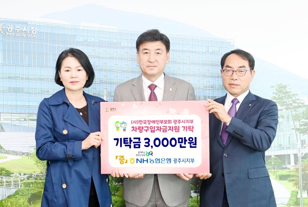 [광성일보] NH농협 광주시지부는 9일 광주시청을 방문해 장애인 및 장애인가족을 위해 다양한 사업을 운영하고 있는 장애인부모회의 대상자 송영 서비스용 차량 구입을 위해 사용해 달라며 성금 3천만원을 기탁했다.