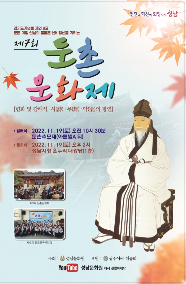 [광성일보] 성남문화원(원장 김대진)은 경기도기념물 제219호 둔촌 이집 선생의 올곧은 선비정신과 효행을 기리는 ‘제7회 둔촌문화제’를, 11.19(토) 오전10시 30분 하대원동 소재 둔촌 추모재에서 ‘참배 및 헌화례’를 한 후, 오후2시부터는 성남시청 1층 온누리대강당에서 시(詩)·무(舞)·악(樂)의 향연인 공연으로 개최한다.