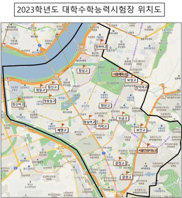송파구(구청장 서강석)가 오는 17일 대학수학능력시험에 응시하는 수험생에게 교통편의를 제공하고 안전한 수송을 지원하기 위해 특별교통대책을 수립‧추진한다.송파구에는 ▲일반시험장 16개교 ▲별도시험장 2개교(서울체육고, 인공지능고) 총 18개의 학교에 시험장이 설치됐으며 9,109명의 수험생이 시험을 치른다.