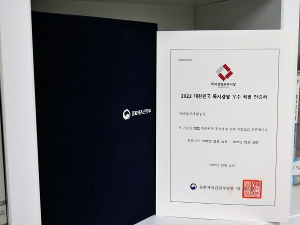 [광성일보] 성남도시개발공사(이하 공사)가 ‘2022 대한민국 독서경영 우수직장 인증제’에서 인증을 획득하며, 5년 연속 독서경영 우수 직장으로 선정됐다고 16일 밝혔다.