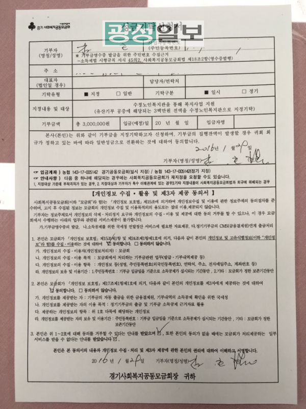 수정노인종합복지관에서 밑반찬지원사업 및 사례관리 서비스를 이용하던 김○호 어르신은 월세 보증금이었던 전 재산 2,000,000원을 복지관에 사후 기증한 뒤 세상을 떠났다. 어르신은 기관 서비스에 대한 고마움의 마음으로 2016년 사후기증을 결정했다.