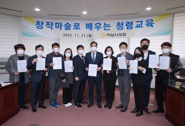 [광성일보] 하남시의회(의장 강성삼)는 지난 21일 하남시의회 소회의실에서 강성삼 의장을 비롯한 의원 10명은 ‘청렴연수과정교육’을 실시했다.이날 청렴교육은 올해 3월부터 시행된 「2022년도 부패방지교육 운영지침」에 의거 지방의회 의원을 포함한 고위공직자는 반드시 대면의 방법으로 청렴교육을 이수해야 한다는 지침에 따라 이뤄졌다.