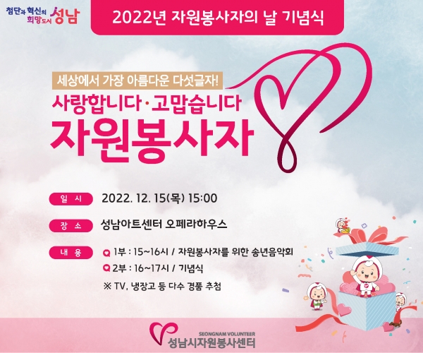 [광성일보] 성남시(시장 신상진)는 자원봉사자들의 헌신과 노고를 격려하기 위한 뜻깊은 자리로 ‘2022년 성남시 자원봉사자의 날 기념행사‘를 개최한다.2022. 12. 15(목) 15:00시에 성남아트센터 오페라하우스에서 개최되는 이번 행사는 자원봉사자를 위한 송년음악회와 50명의 우수봉사자 표창 시상, 의식행사 등의 기념식으로 진행되며 성남시민 누구나 참여할 수 있다.