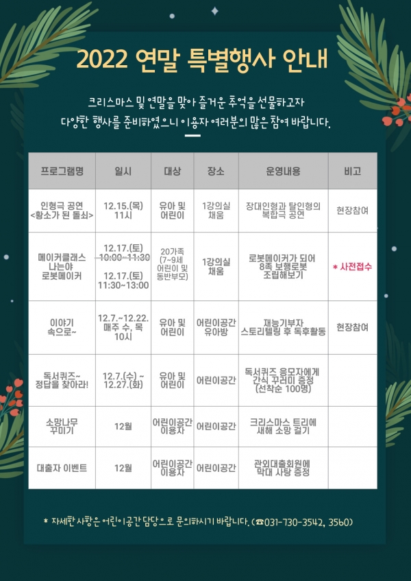 [광성일보] 경기성남교육도서관(관장 전성룡)은 12월 1일부터 31일까지 유아와 어린이를 대상으로 연말 특별행사를 운영한다.이번 행사는 유아와 어린이에게 독서체험과 독서문화활동을 통해 책과 친해지는 기회를 제공하여 독서에 대한 흥미와 도서관에 대한 친밀감을 높이기 위해 교육도서관이 마련했다.