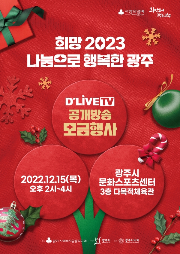 경기도 사회복지공동모금회 주최로 ‘희망 2023 나눔으로 행복한 광주’ 공개방송 모금행사를 오는 15일 오후 2시부터 4시까지 광주시 문화스포스센터 3층 다목적체육관에서 진행한다고 8일 밝혔다.