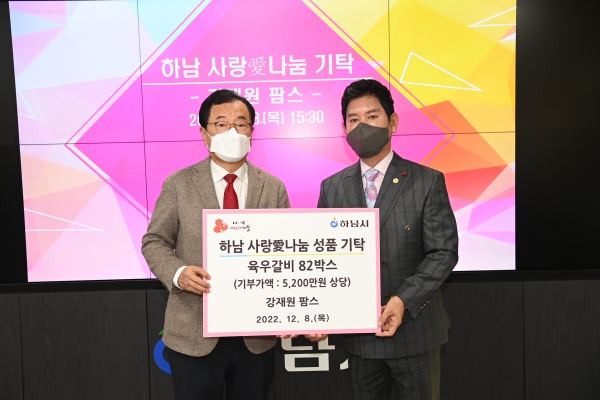 [광성일보] 강재원 팜스는 지난 8일 하남 사랑愛나눔 성품으로 육우갈비 82박스 (기부가액 5,200만원 상당)을 전달하고 기탁식을 가졌다.이날 기탁식에는 이현재 하남시장을 비롯하여 강재원 팜스의 강재원 대표, 노정희 회장, 안재연 상무 및 하남문화재단 이연구 대표이사, 성안교회 장학봉 목사가 참석하여 자리를 빛냈다.