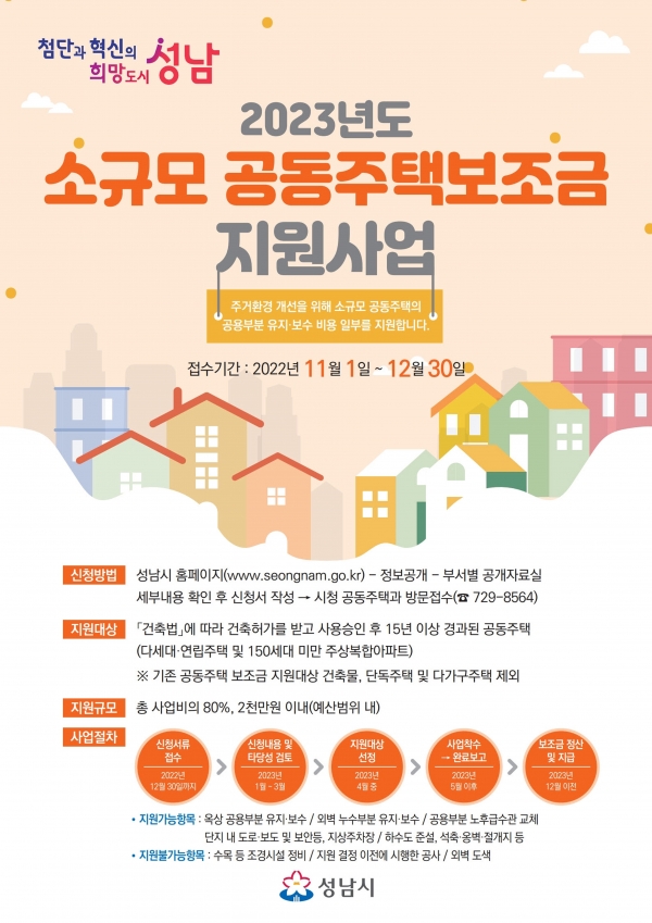 [광성일보] 성남시는 이달 30일까지 소규모 공동주택 보조금 지원신청을 받는다.노후한 소규모 공동주택의 쾌적한 주거환경 조성을 위해 낡은 공동시설 개선공사를 지원하려는 사업이다.지원 대상 주택은 건축법에 따라 허가받아 건축한 다세대주택, 연립주택과 150세대 미만의 주상복합아파트 중에서 사용승인일로부터 15년 이상 지난 건축물이다.