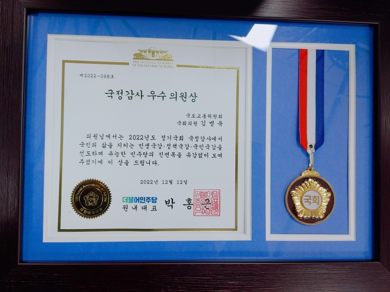 민주당은 매년 국정감사에서 국민의 삶을 지키는 민생국감‧정책국감‧국민국감을 선도하며 유능한 민주당의 진면목을 보여주는 등 활약을 펼친 국회의원을 선정해 시상하고 있다.김병욱 의원은 20대 국회 전반기 교육문화관광체육위원회, 20대 국회 후반기 정무위원회, 21대 국회 전반기 정무위원회 간사, 21대 국회 후반기 현재 국토교통위원회 를 거치며 7년 동안 한 차례도 빠짐없이 더불어민주당 선정 국정감사 우수의원에 선정되는 영광을 안았다.